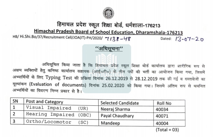 HPBOSE has been announced final result for post of Junior Office Assistant (Information Technology) For physically challanged candidate for 3 posts.